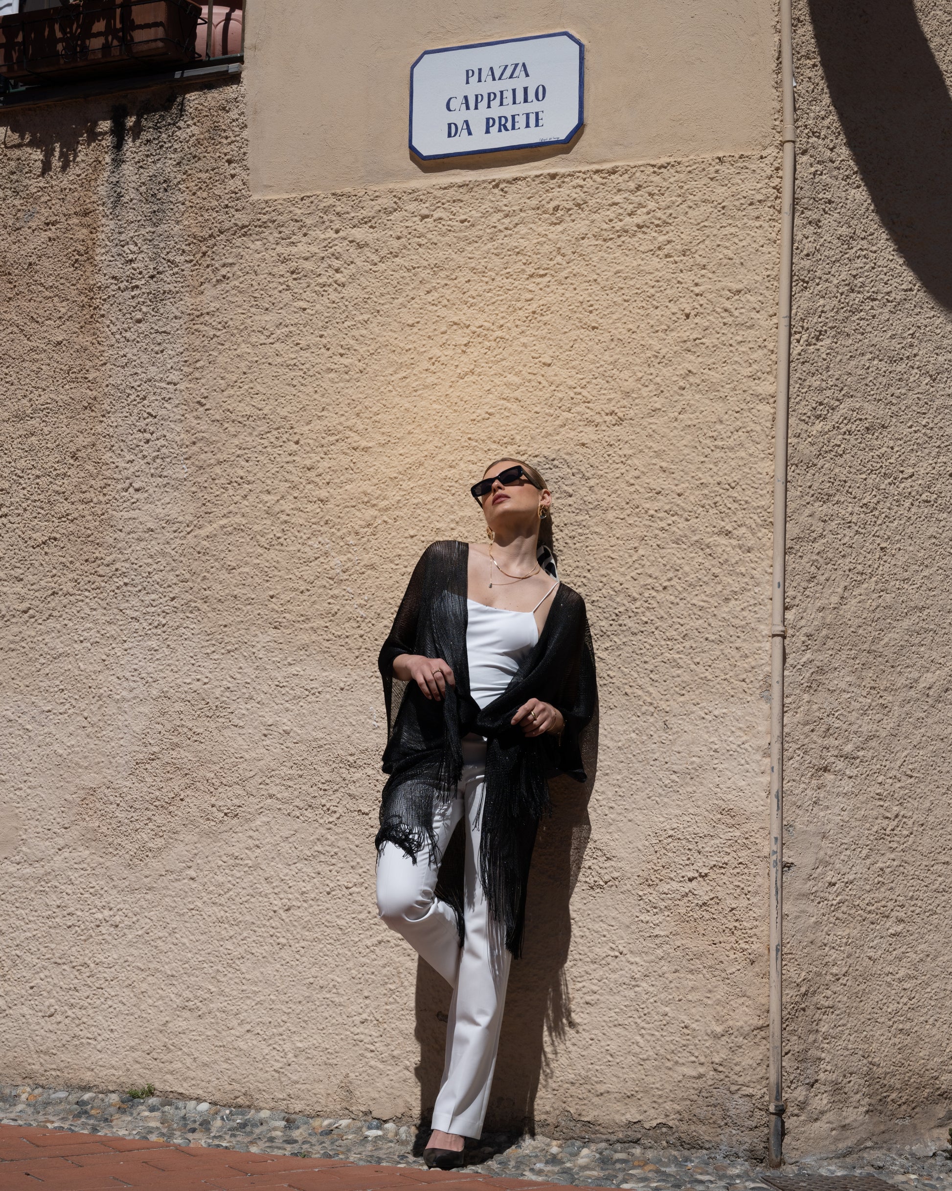 Esplora l'eleganza senza tempo con il nostro kimono lurex NERO. Questo capo versatile può essere indossato come copricostume per gli aperitivi glamour in spiaggia o per dare un tocco in più al tuo look cittadino. Realizzato con tessuto lurex brillante, aggiunge una nota di lusso a qualsiasi outfit.